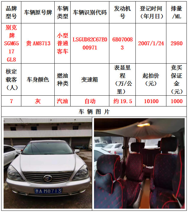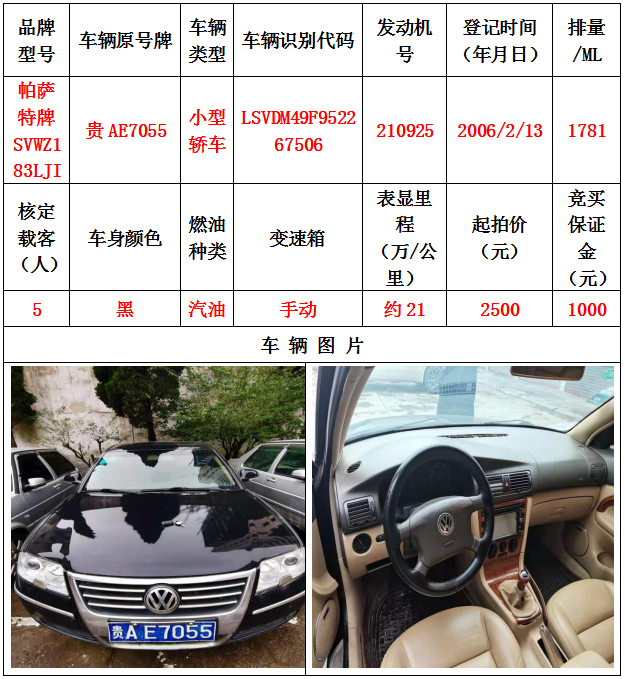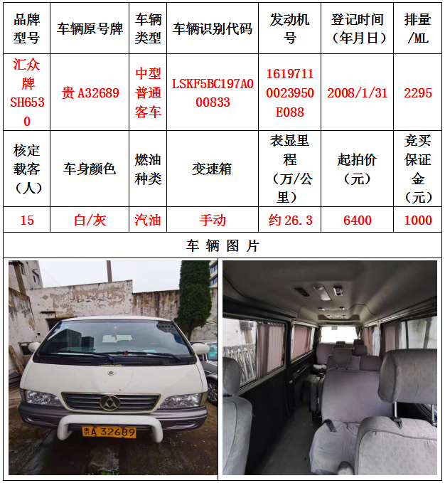 本次拍賣會拍賣的車輛共計10輛車,分別為帕薩特牌SVWZ183LJI小型轎車一輛、匯眾牌SH6530中型普通客車一輛、別克牌SGM6517小型普通客車一輛、別克牌SGM7161LE小型轎車一輛、寶來牌BORA1.6小型轎車一輛、捷達牌FV7160GiFE3小型轎車五輛(詳情見下文),為打包整體拍賣,不作拆分,整體起拍價:33900元,且只對標(biāo)的現(xiàn)狀進行拍賣,不作任何質(zhì)量擔(dān)保。