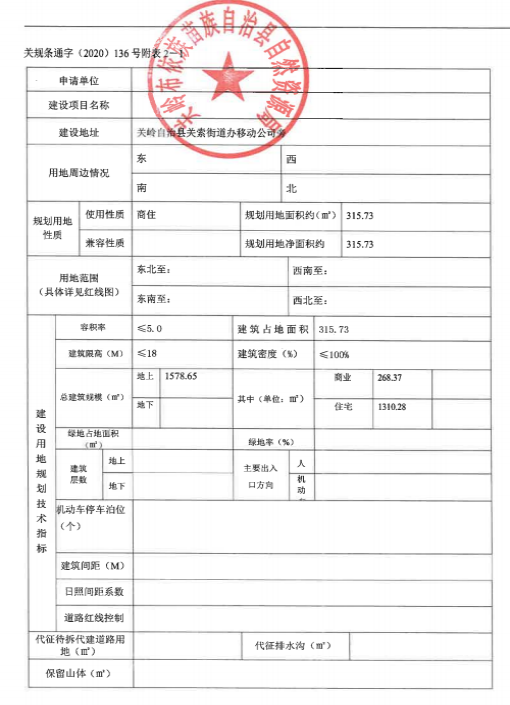 3、買受人須在簽訂出讓合同后,承諾一年內開工建設,三年內必須竣工驗收。如不能按期開工、竣工,自違約之日起,每日須支付土地出讓價款的0.55‰的違約金。建設嚴格按照自然資源局出具的關規(guī)條通字(2020)136號《規(guī)劃設計條件通知書》中的規(guī)定和要求進行建設:容積率≤5.0,建筑密度≤100%;地上總建筑面積:1578.65㎡,其中商業(yè)建筑面積:268.37㎡,住宅建筑面積:1310.28㎡;建筑限高≤18米。(詳見附件1)
