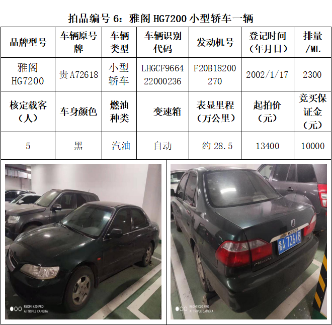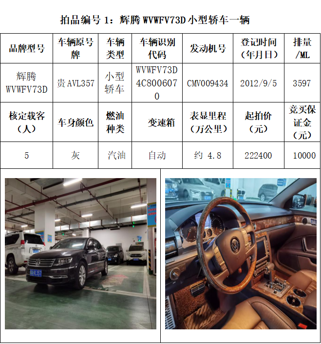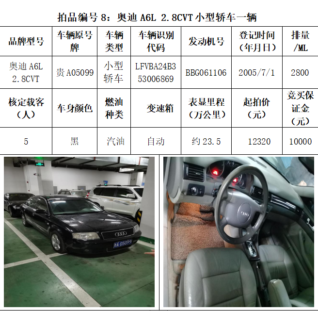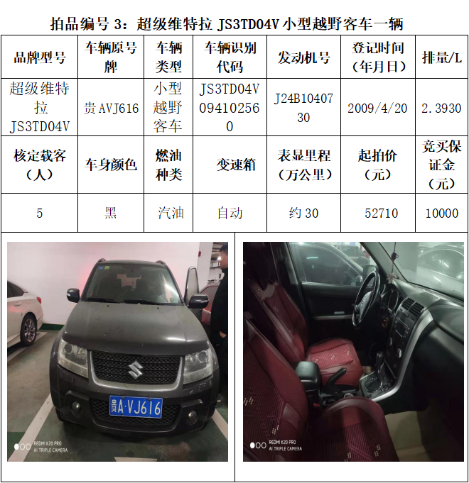 受委托,本公司定于2021年3月26日(星期五)下午14:30時,在貴陽市中華南路20號新大陸數(shù)碼廣場10樓D座拍賣廳公開拍賣以下車輛:普拉多越野車1輛、超級維特拉越野車1輛、別克商務旅行車1輛、輝騰轎車1輛、途勝越野車1輛、雅閣轎車2輛、奧迪轎車1輛,共計8輛車。