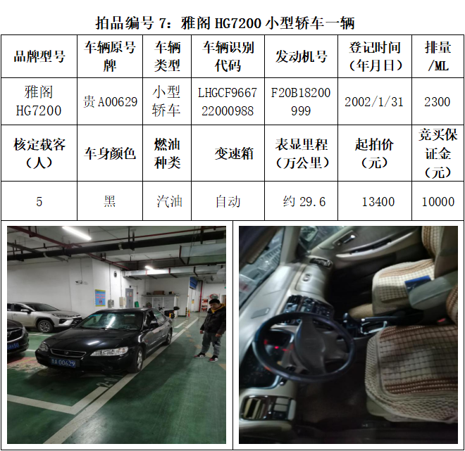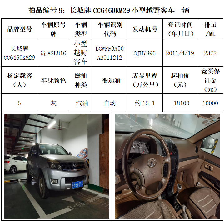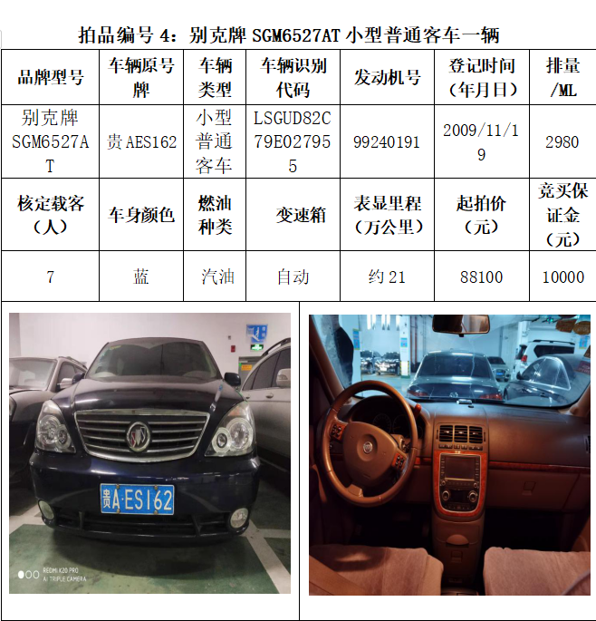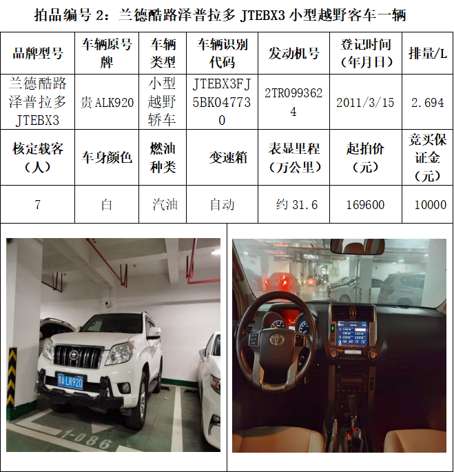 受委托,本公司定于2021年3月26日(星期五)下午14:30時(shí),在貴陽市中華南路20號新大陸數(shù)碼廣場10樓D座拍賣廳公開拍賣以下車輛:普拉多越野車1輛、超級維特拉越野車1輛、別克商務(wù)旅行車1輛、輝騰轎車1輛、途勝越野車1輛、雅閣轎車2輛、奧迪轎車1輛,長城牌小型越野客車1輛,共計(jì)9輛車。