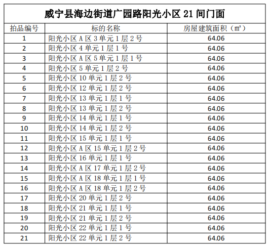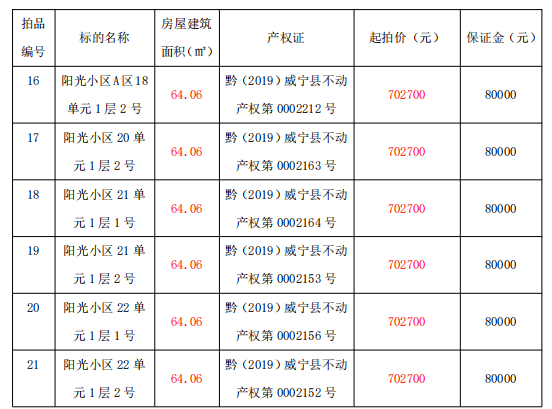 拍品編號16-21號標的位于威寧縣海邊街道廣園路陽光小區(qū),房屋結(jié)構(gòu)均為:混合結(jié)構(gòu),權(quán)利性質(zhì):國有土地/出讓/其他,用途:商服用地/商業(yè)服務(wù),使用期限:2012年12月20號至2052年12月19日。