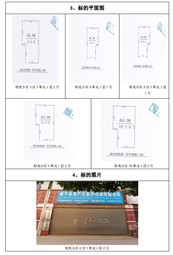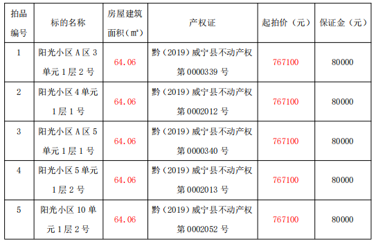 拍品編號1-5號標的位于威寧縣海邊街道廣園路陽光小區(qū),房屋結(jié)構(gòu)均為:混合結(jié)構(gòu),權(quán)利性質(zhì):國有土地/出讓/其他,用途:商服用地/商業(yè)服務(wù),使用期限:2012年12月20號至2052年12月19日。