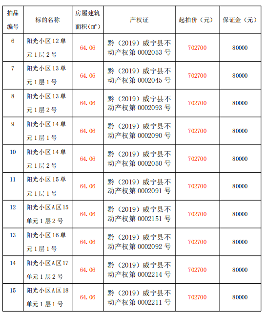 拍品編號6-15號標的位于威寧縣海邊街道廣園路陽光小區(qū),房屋結(jié)構(gòu)均為:混合結(jié)構(gòu),權(quán)利性質(zhì):國有土地/出讓/其他,用途:商服用地/商業(yè)服務(wù),使用期限:2012年12月20號至2052年12月19日。