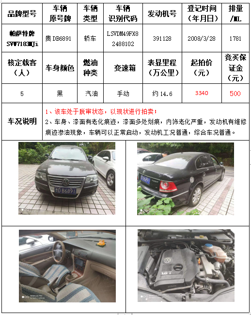 拍品編號(hào)8:帕薩特牌SVW7183MJi轎車一輛