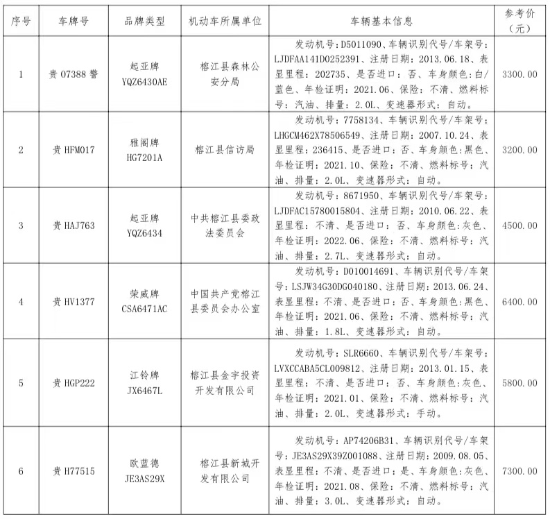 三、標(biāo)的展示地點及方式:榕江縣財政局,拍賣車輛以現(xiàn)狀、現(xiàn)樣進(jìn)行展示,意向客戶可自行到展示地點查勘(節(jié)假日除外)。