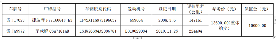 一、拍賣(mài)標(biāo)的:貴J17023、貴JA9972機(jī)動(dòng)車(chē)各一輛。