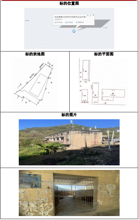 2、天生橋收購點:坐落于余慶縣構(gòu)皮灘鎮(zhèn)天生橋村;土地使用權性質(zhì):劃撥;證載土地使用權面積:1513.1㎡;證載建筑面積:1040.95㎡;起拍價:15.93萬元;保證金:2萬元;