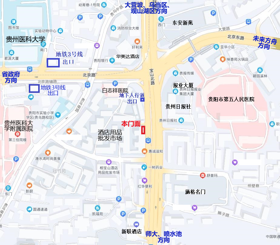 門面臨寶山北路,臨街面寬13.2米,目前空置,位于相寶山酒店用品批發(fā)市場大門右側(cè),與貴州日報(bào)社隔街相望。