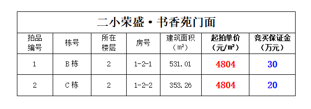 二小榮盛·書(shū)香苑門面2間,建筑面積:353.26—531.01㎡,起拍單價(jià):4804元/㎡;