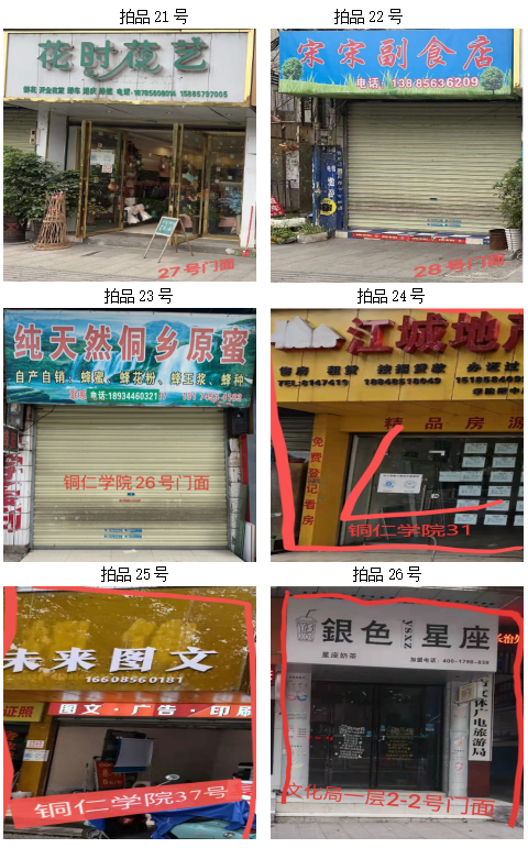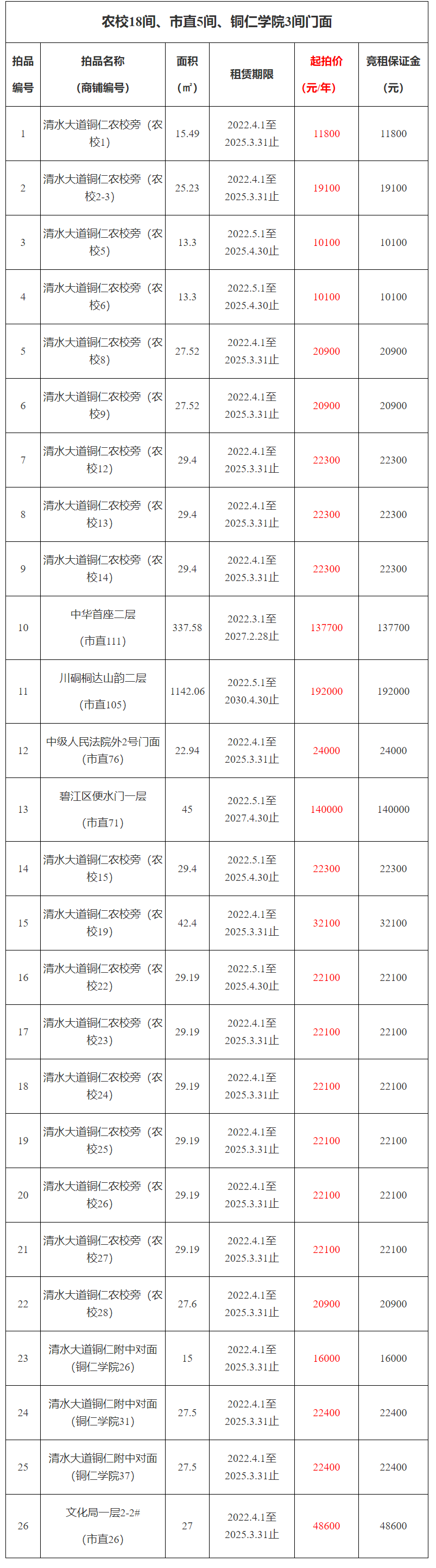 25、清水大道銅仁附中對(duì)面(商鋪編號(hào):銅仁學(xué)院37),面積:27.5㎡,租賃期:3年,起拍價(jià):22400元/年,競(jìng)租保證金:22400元;